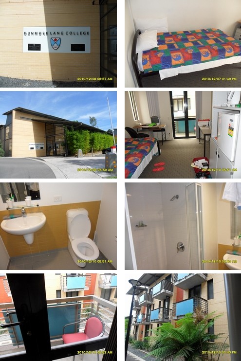 当天(2010年12月5日)是周日,司机说有很多人驱车从外地过来玩或看望朋友,所以有点塞车。我们花了将近一个小时才到达Dunmore Lang College。学校的接待人员把我带到宽敞明亮的房间,让我有一种回到家的感觉。宿舍是那么整齐、干净,床铺是那么的柔软舒适,还有一个阳台。想到能在这里住一个星期,心里不禁乐开了花。