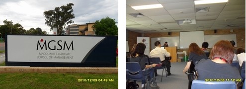 第六天(2010年12月9日周五),我们前往Macquarie的Faculty of Business and Economics参观,并听学院的负责人作报告。Macquarie的Master of Commerce有9个专业供学生选择,1.5年full-time课程,共有12个units和48个credit points,无需相关背景,如果有相关背景可免修部分学分一年就可完成,入学要求:本科学位,GPA2.7。Professional Accounting包括:Bachelor of Commerce-Professional Accounting, Master of Accounting (Professional), Master of Accounting (CPA Extension).这三个课程都受CPA Australia, CA (Institute of Chartered Accountants in Australia)和NIA (National Institute of Accountants)认可。其中Bachelor of Commerce-Professional Accounting入学要求为IELTS6.5(单项6.0),无需工作经验;Master of Accounting (Professional)是一个18个月full-time课程,入学要求为IELTS6.5(单项6.0),无需工作经验,GPA2.7;Master of Accounting (CPA Extension) 是一个2.5年full-time课程,CPA extension units只能在North Ryde校区上课,入学要求为IELTS6.5(单项6.0),无需工作经验,GPA2.7。另外Macquarie还提供Actuarial Studies,Applied Finance的课程可供学生选择。