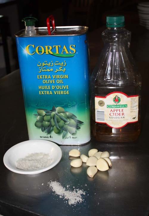 所需材料:橄榄油、醋、蒜头、盐,还可以加一些鸡蛋、芥末酱和酱油