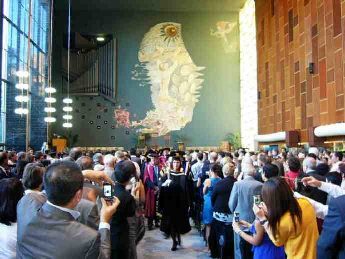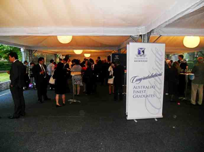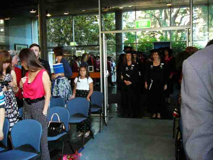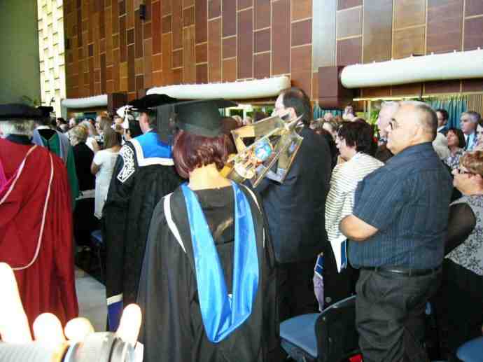 墨尔本大学法律系出了一位现任的女总理,使本来就名列前茅的墨大更是锦上添花。一时间法律系奇货可居。领好毕业礼服,开会前乘隙赶紧拍照留念。和家人分享喜悦,和同窗共享成功。电视台提前做了充分的准备,录制了素材,女主持人也声情并茂地介绍了该校的辉煌校史。