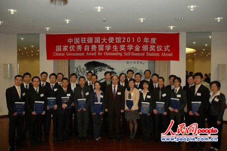 中国驻德国大使馆7日举行仪式,驻德大使吴红波向获得2010年度国家优秀自费留学生奖学金的36位旅德中国留学生颁发获奖证书。