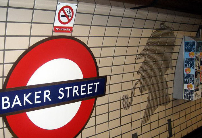 在许多出口甬道的墙壁上,还有一些记录英国历史文化背景的壁画涂鸦。比如位于伦敦市中心Baker Street站,就是1863年世界第一条地铁的一部分,站标旁边印有福尔摩斯阴影头像,小说人物大名鼎鼎的福尔摩斯侦探Sherlock Holmes就曾住在221B Baker Street上。走出该站,往南走10分钟就是Oxford Street,购物天堂一条街。