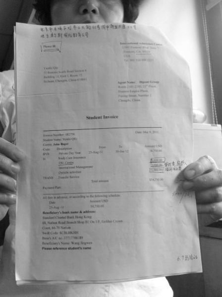 刘女士说,前两天曾接到北京一个电话,一个自称“张老师”的人说是皮尔斯公司的,“她说如果不把钱交齐,就取消我儿子的出国留学资格。”华西都市报记者刘晓娜摄影报道