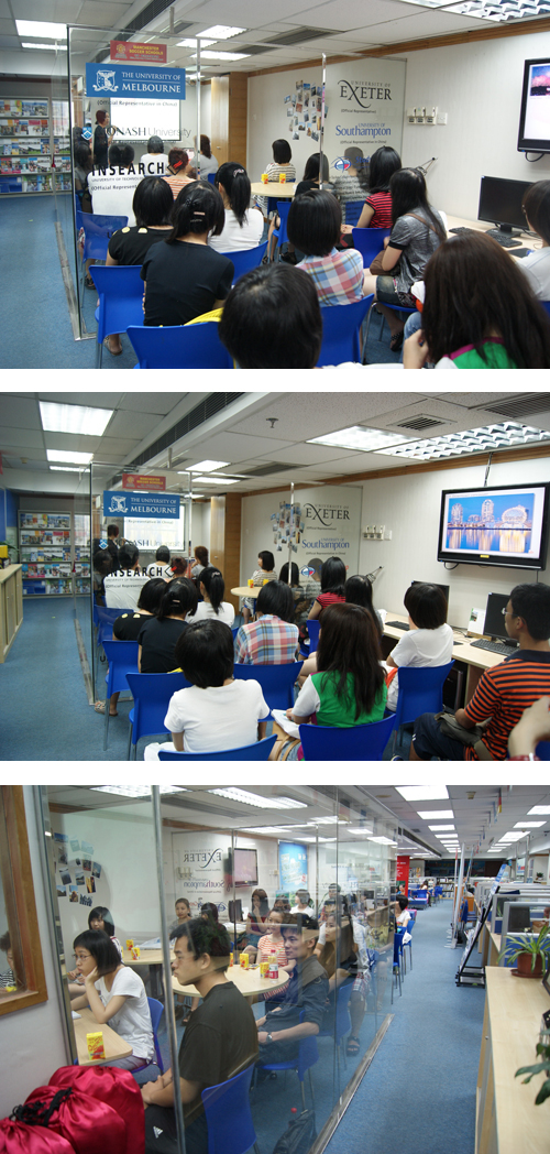 2011年8月13日周六下午侨谊留学举办了精英留学生心得分享会。分别由留学加拿大,英国的精英海归学生为广大学生与家长分享各自的留学心得与体验。他们都是多年前经侨谊办理出国的学生,现场更为有留学意向的学生们解答疑难。另外还有DBS星展银行分享了海外理财资讯,并在现场与学生、家长进行互动问答环节,送出精美礼品。每个周末侨谊都会举办类似的讲座分享会,不同的主题内容适合不同情况的学生,诚邀广大学子与家长前来参与!