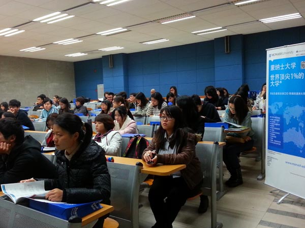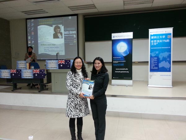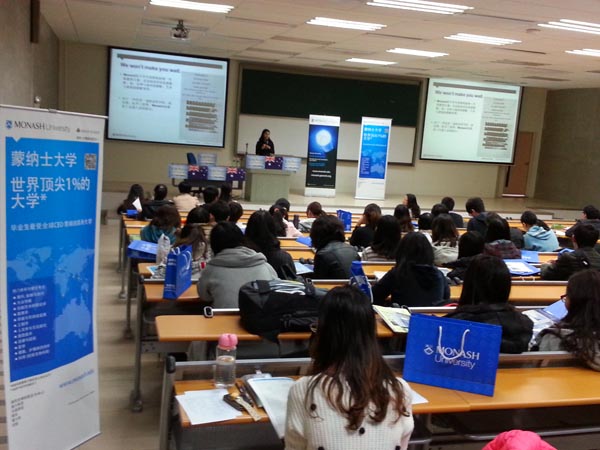 2012年12月5日,Monash University中国区代表谭慧娟女士应北京师范大学、香港浸会大学联合国际学院负责学生职业发展的张蔚副处长邀请,为学生作就业发展规划及就业指导讲座。谭女士为同学们介绍了Monash University开设的热门专业以及澳洲就业的热门职业,同时让同学们了解到Monash University是澳洲八大就业率最高的大学。并为拿到Monash University研究生入学通知书的学生作入学前的准备分享,比如说签证指导。现场还为4位同学办理了入学申请表的填写。现场气氛十分活跃,此次活动得到了学校的大力支持,并邀请谭女士在合适的时候再次为同学们作指导。