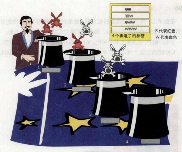 问题:魔术师将6只白色兔子和6只红色兔子放在4顶帽子里,每顶帽子上面都贴有标签,如图所示。但是这些标签全部都贴错了。4个选手每个人拿到一顶帽子和帽子上的标签(弄错了的标签)。每个选手可以从他的帽子中拿出2只兔子。要求他们说出自己帽子里的3只兔子的颜色。第1个选手拿出了2只红色兔子,他说:“我知道剩下的1只兔子是什么颜色的了。”第2个选手拿出了1只红色和1只白色的兔子,他说:“我也知道剩下的1只兔子是什么颜色的了。”第3个选手拿出了两只白色兔子,他说:“我不知道我帽子里的第3只兔子的颜色。”第4个选手说:“我不需要拿兔子。我已经知道我帽子里所有兔子的颜色,而且我也知道了第3个选手的另外1只兔子的颜色。”他是怎么知道的呢?