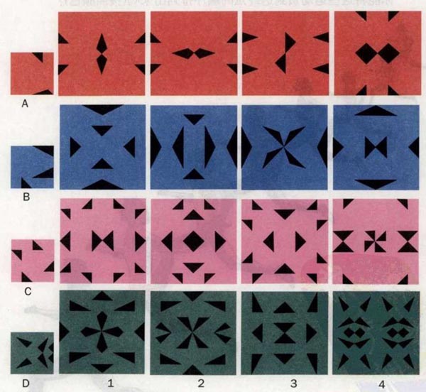 问题:将一个大正方形两边对折,折成它1/4大小的小正方形,然后在小正方形上打洞,如图所示。将小正方形展开,会得到一个对称图形。你能说出A,B,C,D4个小正方形对应的展开图分别是哪个吗?