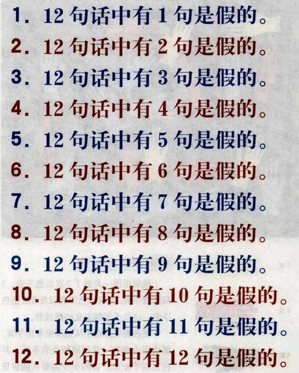 答案:第11句话肯定是真的。因为这11句话中每一句都与其他11句矛盾,因此只可能有一句是真的,即其中11句都是假的。