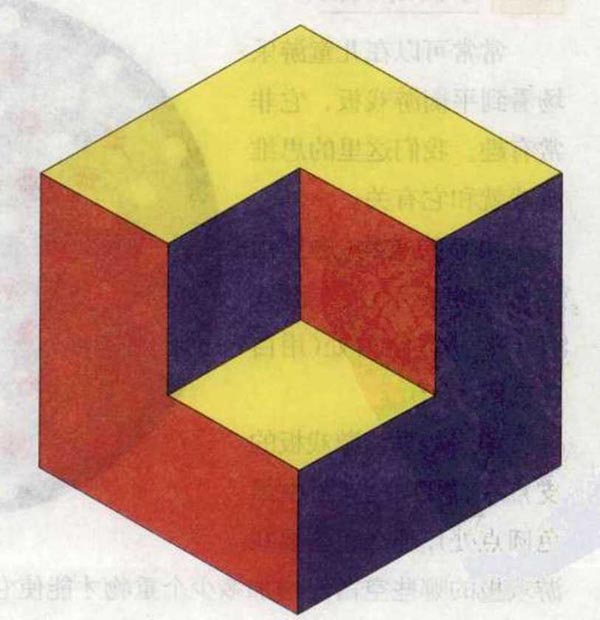问题:有些三维幻觉在平面上也会出现。在所给出的这幅图中,你看到了什么?一个小正方形在一个大正方形的一角外面?一个小正方形在一个大正方形的一角里面?还是一个大正方形的一角被挖去了一个小正方形?