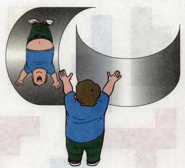 问题:如图所示,男孩看左边的凸面镜发现自己是上下颠倒的。然后将镜子翻转90度,这时候男孩看到的自己是什么样子的?