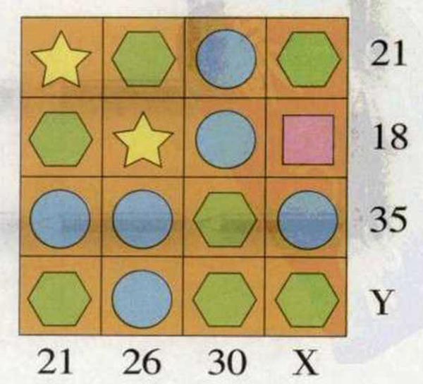 答案:X=22, Y=25。每个五角星等于1,每个六边形等于5,每个圆形等于10,每个正方形则等于2。图中的数字代表了每一行或每一列图形相加总和的数值。