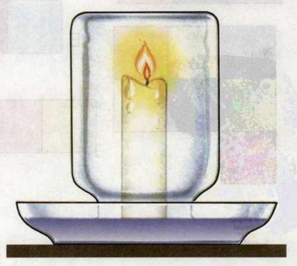 问题:如图所示,把一根点燃的蜡烛放在一个装有水的容器里,再在蜡烛上面罩上一个玻璃瓶。你能预测一下,这个实验最终会出现什么结果吗?