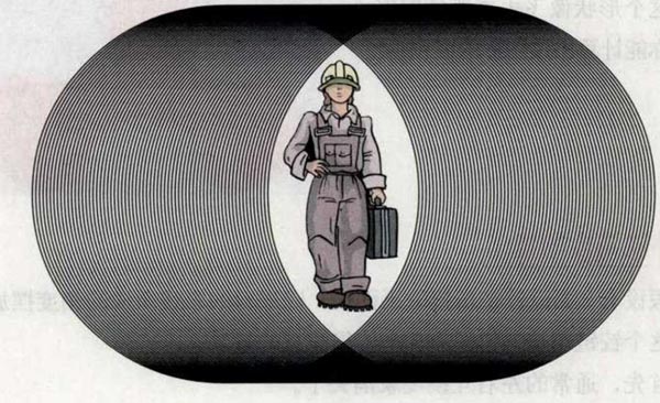 答案:盯着图看,这个人一会儿在管子左 边,一会儿在管子右边。