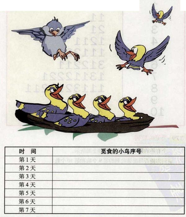 问题:7只小鸟住在同一个鸟巢中。它们的生活非常有规律,每一天都有3 只小鸟出去觅食。7天之后,任意2只小鸟都在同一天出去觅食过。将7只小鸟分别标上序号1〜7,请你将它们这7天的觅食安排详细地填在表格中。