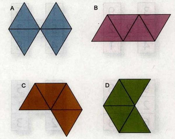 答案:B,图形B是唯一将会制造出一个四面 三角形的金字塔图形。