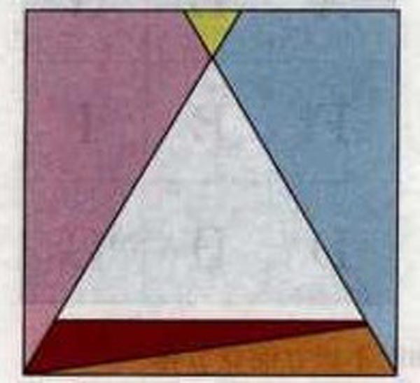 问题:将下边的图形复制到另外一张纸上,然后用剪刀仔细地将图形剪下。现在交给你的挑战就是将这些图形进行排列,使它们“制造出” 一个等边三角形。