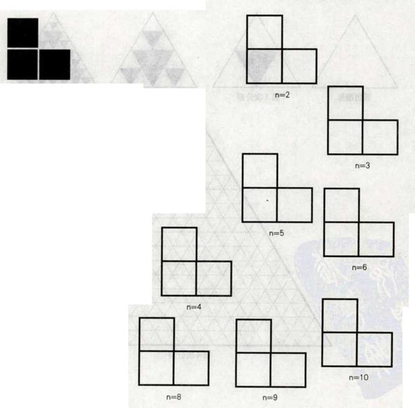 问题:1990年福瑞斯•高波尔提出了这个问题:由3个小正方形组成的L形结构可以被分成不同份数的形状相同、面积相等的部分吗?依据已经给出的数字,你可以将它平均分成与数字相等的份数吗?