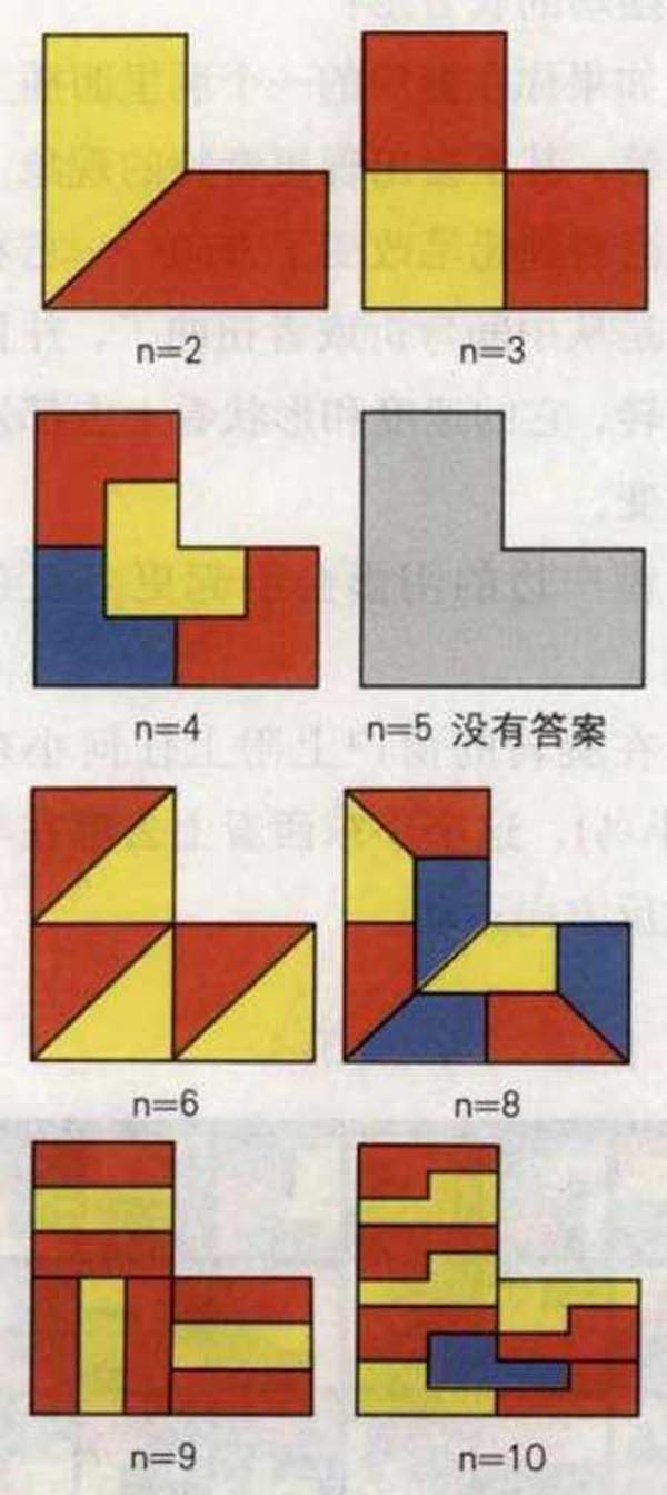 答案:显然L形结构可以被分割成任何3 的倍数。对于n=4的答案是一个经典的难题,这时被分割成的部分是和原来一样的L形结构。(这种图形被称作“两栖动物”,因为每个这种图形都可以被继续分割成4部分。)对于n=2的答案是另外一种图形(同n=8,32,128,512,…的答案类似)。你可以把每部分都分割成和它原来一样的4部分吗?这个问题最早出现在1990年出版的《娱乐数学杂志》中。