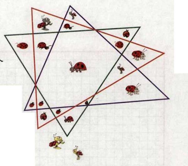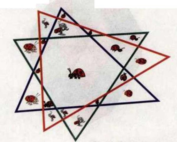 答案:如图,19个瓢虫分别在不同的空间内。一般情况下,3个三角形相交,最多只能形成19个独立的空间。这一点很容易证明。两个三角形相 交,最多能够形成7个独立的空间,而第3个三角形的每一条边最多能够与4条直线相交,因此它能够与前两个三角形再形成12个新的空间,所以加起来就是19个空间。