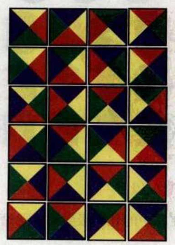 问题:一个正方形被它的对角线分成了 4部分。用4种颜色给正方形上色,上 色样板如图1所示。有6种不同的方法给正方形上色(旋转所得的正方形不算做新的正方形)。你能把它们都找出来吗? 你将每一种正方形再复制3份,组成一套24个正方形,将它们剪下来并解决这个经典的题目:你能否用这一套正方形拼成一个4 x 6的长方形,要求相邻正方形的边的颜色相同,符合多米诺骨牌风格。
