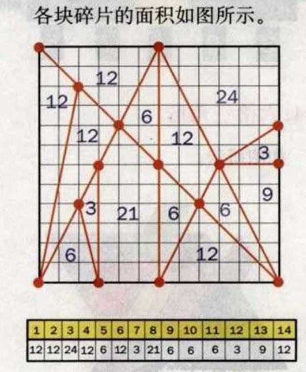 问题:据记载,这个跟七巧板类似的有关分割的游戏是由阿基米得发明的, 它又被称为“阿基米得的盒子”。如图所示,一个12X12的正方形由14块不同形状的图形组成。 在这个题目中,每一块碎片的面积都是给定了的。现在请问,你能否算出每一块碎片的面积?