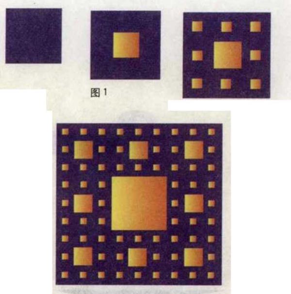 问题:将一个正方形的每条边都 三等分,就可以得到9个小正方形,如图1所示。将最中间的小正方 形涂成黄色。接下来将剩余的8个蓝色小正方形用同样的方法分别分成9个更小的正方形,将中间的小正方形也分别涂成黄色。如果无限重复这个过程,最后黄色部分的面积与最初的蓝色正方形的面积之间有怎样的关系?