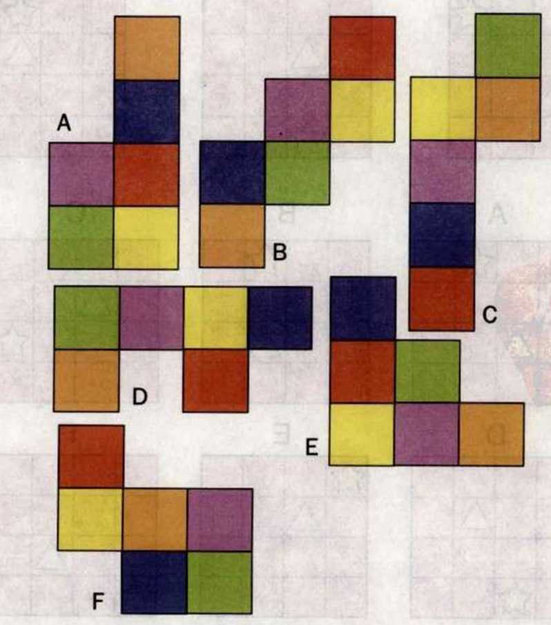 问题:复制并裁下所给出的7个图片。将它们组合成一个魔方,每一行、 列都有6种不同的颜色。想要尝试更大的挑战吗?那就不要将图片裁下, 尝试心算解题。