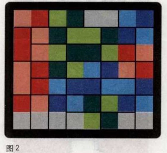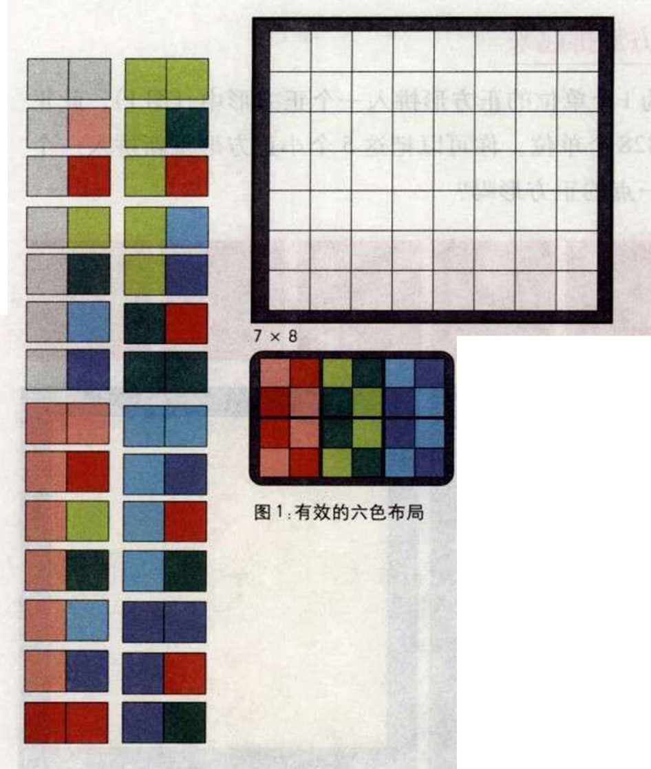 问题:你能将28块彩色的多米诺骨牌放入7x8的游戏板内,使得游戏板上除了8个灰色方块之外,其余的部分可以被分成12组2x 2的双色方块吗?有效的六色布局如图1所示。