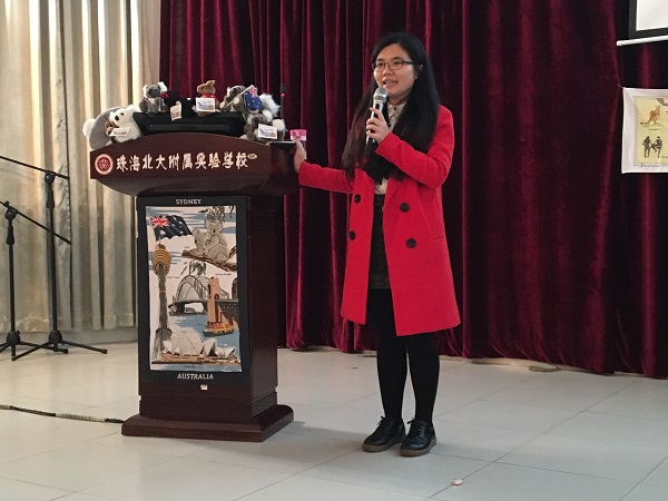 非常感谢Mr Dave关于澳洲情况的讲解,接下来由本次活动的协办方负责人,亦是我们侨谊留学市场部经理Mandy,上台为珠海北大附校的同学们详细讲解本次澳洲东岸夏令营之课程介绍、行程安排、校园环境、旅游景点以及注意事项等概况,随后还特意给同学们播放历年参加澳洲东岸夏令营的学生视频。