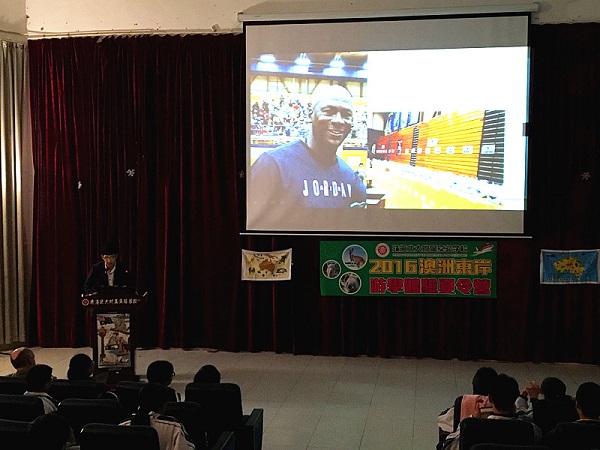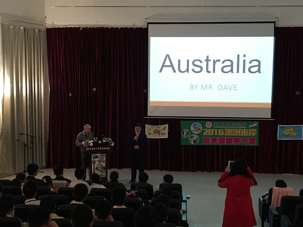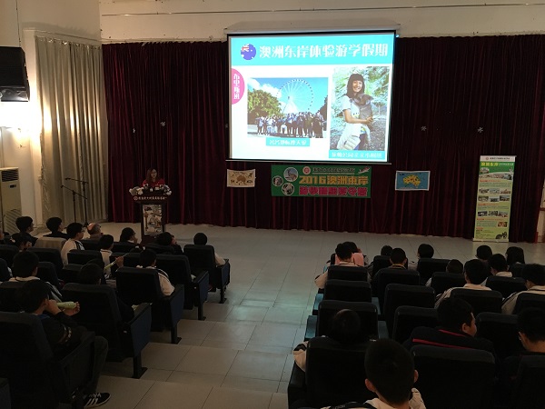 事不宜迟,珠海北大附校国际部黄主任宣布2016年珠海北大附校首季夏令营宣讲会正式开始,首先由贵校澳洲外籍教师Mr Dave上台为同学们讲解澳洲的概况,让同学们深刻认识到澳洲的环境气候、风土人情、旅游观光及澳洲八大名校的情况。
