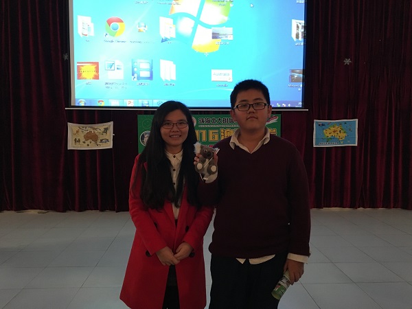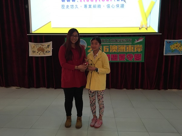 Mandy提出的问题完全难不住国际班的孩子们,看来他们对澳洲的常识还是了如指掌!随后,答对题目的同学们都兴奋地上台领奖,国际班黄主任以及Mandy一同给孩子们送上精美的考拉、袋鼠小礼品,场面非常温馨呢。